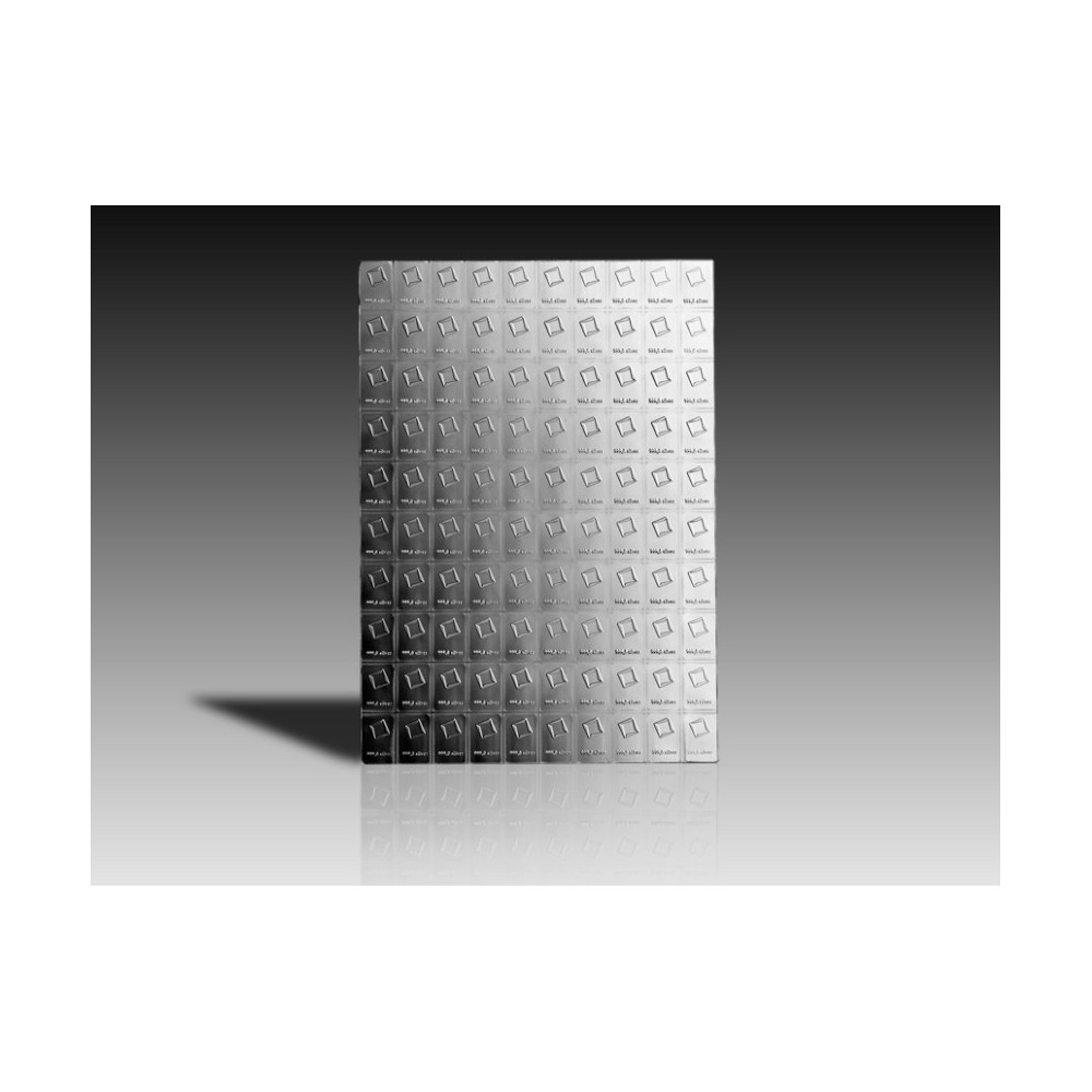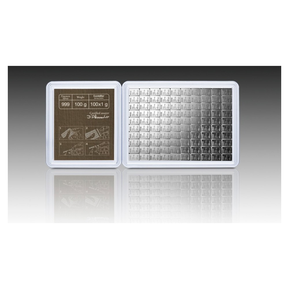 This variant contains 100 detachable 1g bars. Valcambi silver CombiBar™ offers the option of breaking the bar into groups of 1g silver bars or into 100 individual 1g pieces. Each bar is certified by Valcambi and will be accepted anytime, anywhere for its silver value.