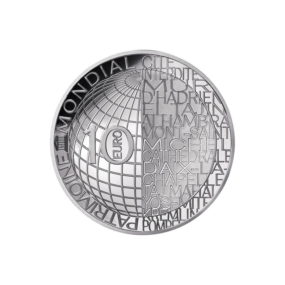 Shows the globe with parallels and meridians on the left side and the inscriptions of the main UNESCO World Heritage Sites on the right side. The inscriptions are carved into the stone and are reminiscent of the Rosetta Stone. The UNESCO logo and the inscription 'World Heritage' surround the left side of the globe. The nominal value is engraved on the left side of the globe and blends perfectly with the parallels and meridians.