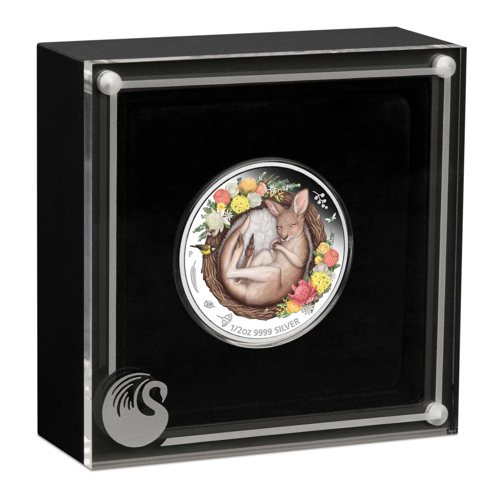 The coin depicts a cute baby kangaroo sleeping in a twig basket lined with fleece - a prop that has become a popular trend in newborn photography among parents around the world. In addition to the Perth Mint's 'P' mintmark, the design also features colourful Australian flowers and wildlife.
