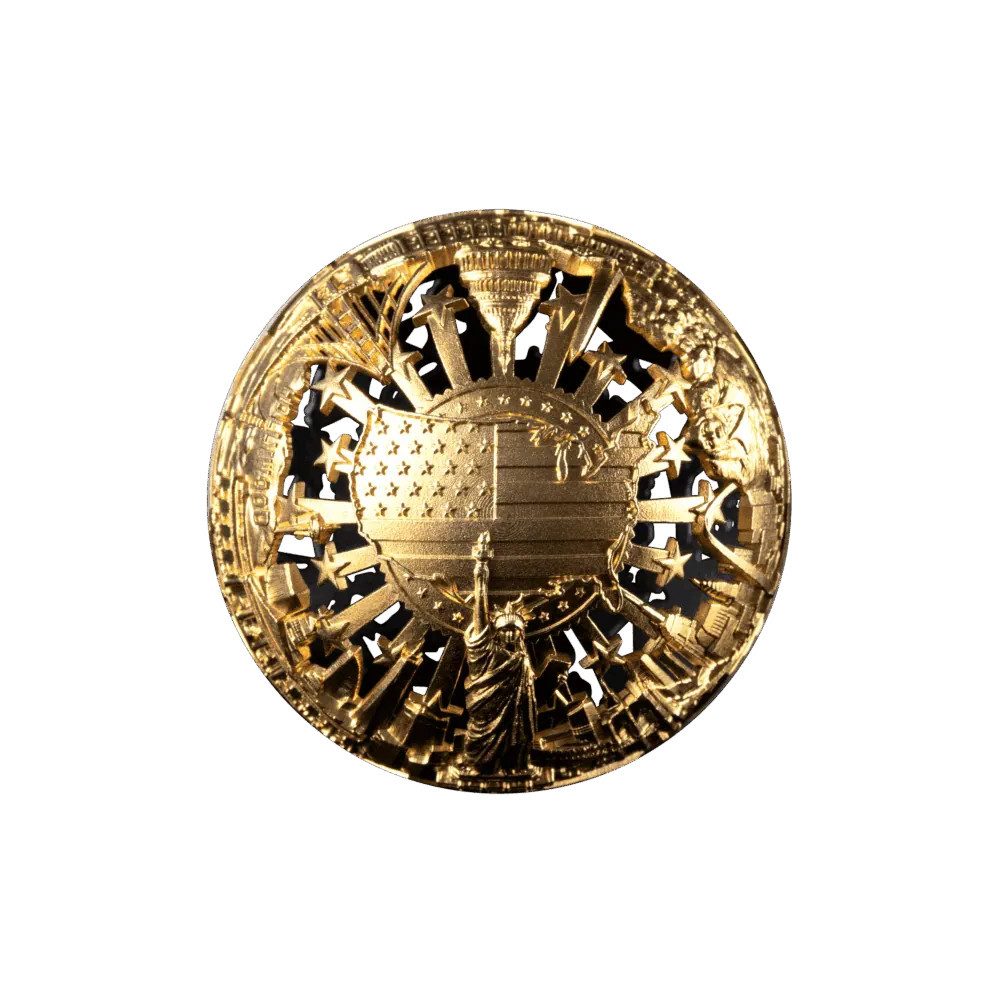 This extraordinary 2-ounce silver coin embodies the tension between revolution and freedom. Two forces united in the blood of America. Revolution as a defiant cry against foreign domination. Battles etched in history. Each strike pulsing with self-determination. Each victory a step toward a new dawn. Freedom as a living flame. Symbols born of this struggle: the Statue of Liberty raising her torch, the Hollywood sign shining above dreams, the Golden Gate Bridge hanging in the light, the Empire State Building towering to the sky. All captured in silver. Wrapped in an antique finish. Plated in 24k gold. Interwoven with filigree as delicate as breath. The coin is housed in a case with a certificate of authenticity. Limited edition of 1 776 pieces worldwide.