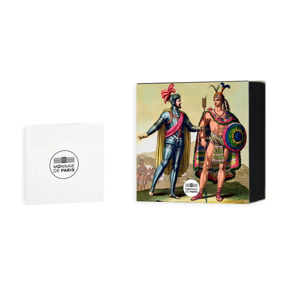 The obverse of this coin features an original composition by engraver Joaquín Jiménez. Two portraits facing each other represent the Spanish conqueror and Atahualpa, the last Inca emperor. In the centre is a gilded Inca idol "EL DORADO" over a mythical lake, where the gold-dust-covered Inca ruler is said to have sacrificed significant wealth to the lake to appease the deity in the water.