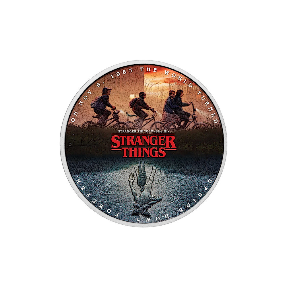 The colorful reverse of the coin features the mysterious world of Hawkins. The top half of the coin depicts Mike, Dustin, Lucas, and Eleven on an adventurous bike ride, while the bottom half depicts the eerie Upside Down with Will and the ominous presence of a demogorgon. The design includes the inscription "ON NOV 6, 1983 THE WORLD TURNED UPSIDE DOWN. FOREVER." along with the "STRANGER THINGS" logo and the Perth Mint's "P" mintmark.
