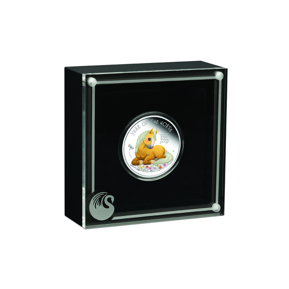 The reverse of the coin features a colourful motif of a happy foal resting on grass decorated with delicate flowers, with a dragonfly flying above. The design also includes the Chinese character for "horse", the inscription "YEAR OF THE HORSE" and the Perth Mint's "P" mint mark.