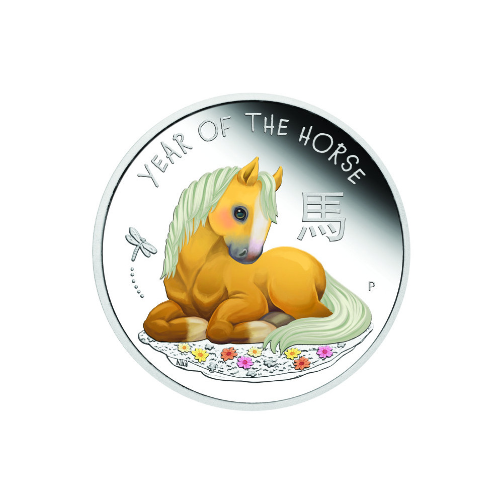 The reverse of the coin features a colourful motif of a happy foal resting on grass decorated with delicate flowers, with a dragonfly flying above. The design also includes the Chinese character for "horse", the inscription "YEAR OF THE HORSE" and the Perth Mint's "P" mint mark.