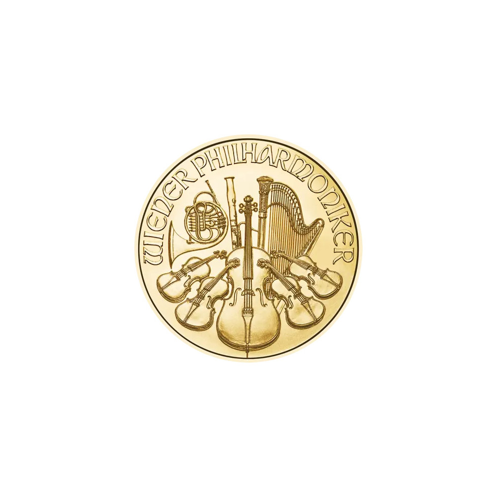 The Vienna Philharmonic owes its name to the famous Austrian orchestra, which is one of the best in the world. The front of the gold coin depicts the great organ of the Vienna Musikverein. The weight of 1/10 ounce, the fineness of 999.9, the year of mintage and the face value of 10 EURO are stamped below the organ. The inscription "REPUPLIK ÖSTERREICH" is stamped above it. On the reverse side, some of the musical instruments of the Philharmonic Orchestra are depicted and on the upper edge you can see the name of the orchestra and the gold coin "WIENER PHILHAMRONIKER". Similar to the above gold coins, the Vienna Philharmonic is available in 1 oz, 1/2 oz, 1/4 oz and 1/25 oz sizes.