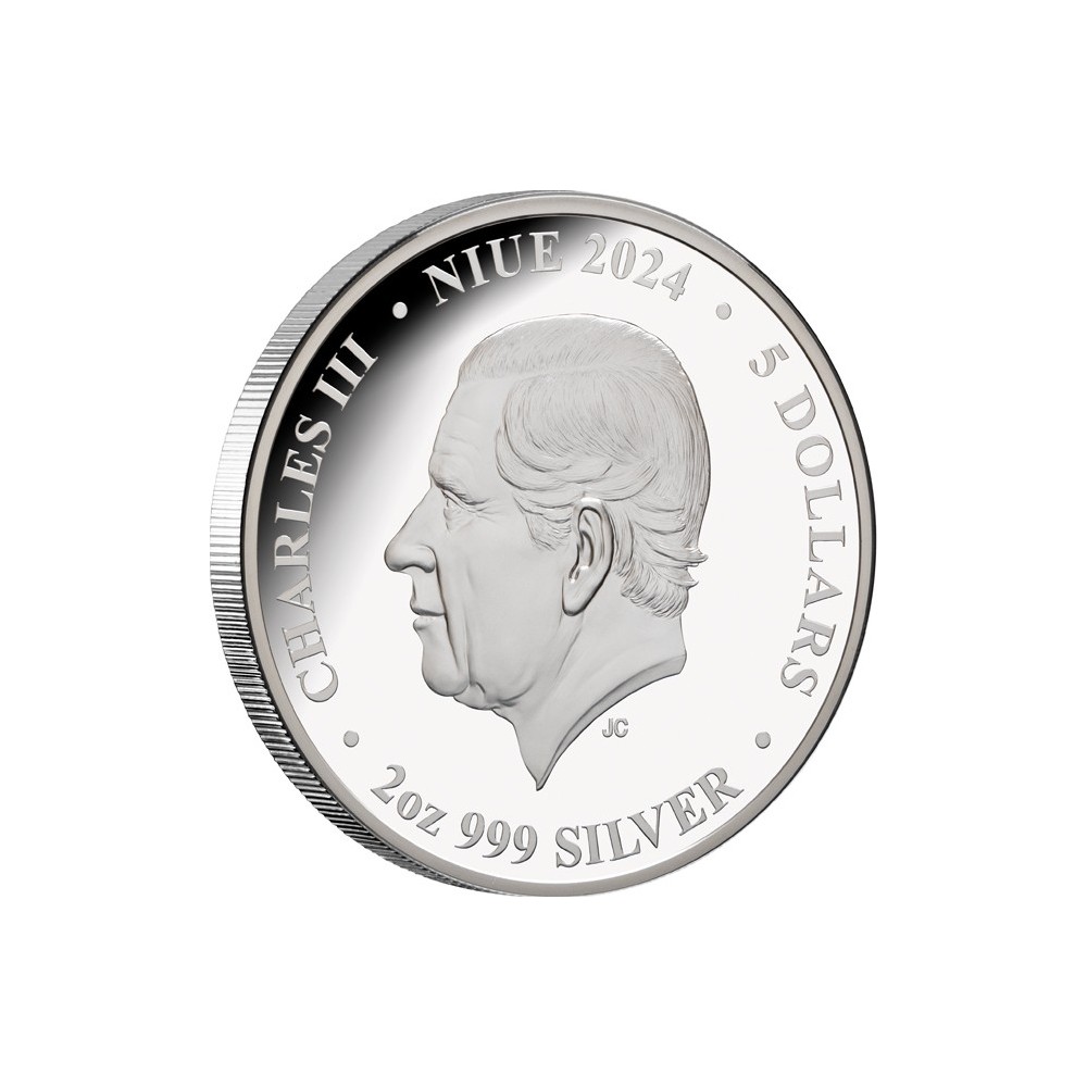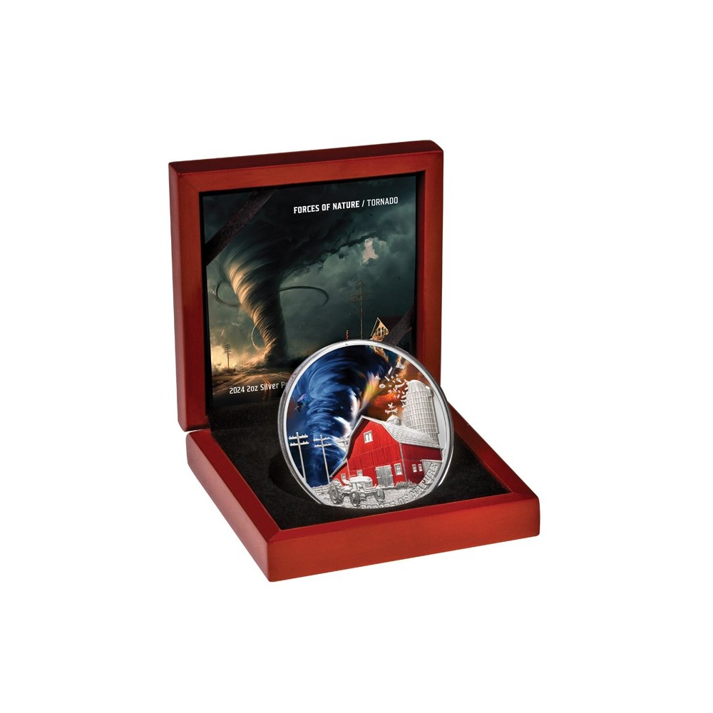 Această monedă colorată din argint de 2 oz din seria "Forțele naturii" este dedicată tornadelor, cel mai viclean și mai puternic spectacol al naturii. Tornadele se nasc din condiții perfecte de furtună și se transformă rapid într-o coloană masivă de aer și resturi. Ele simbolizează o mare forță interioară. Moneda are culori strălucitoare, relief foarte înalt, calitate proof și este livrată într-o cutie cu certificat de autenticitate. Tiraj limitat de 750 de bucăți pentru întreaga lume. Reversul monedei înfățișează nuanțele furtunoase ale furiei întunecate a unei tornade pe fundalul unui hambar roșu aprins și al unui taktor care va fi distrus în curând. Întreaga scenă este foarte dramatică și lasă imaginației ceea ce urmează să se întâmple. Aversul monedei prezintă chipul regelui Carol al III-lea, alături de inscripțiile "CHARLES III" - numele regelui, "NIUE 2024" - țara și anul de emisiune, "5 DOLLARS" - valoarea nominală și 2 OZ 999 SILVER - greutatea și puritatea argintului.