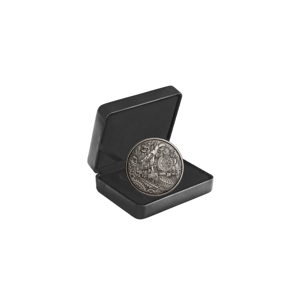 Moneda este fabricată din 3 uncii de argint pur 99,99% și face parte dintr-o ediție limitată de 2 500 de monede la nivel mondial. Marginea zimțată sporește aspectul industrial, iar finisajul antic conferă monedei o patină subtilă care accentuează aspectul metalului și al mașinilor vechi. Pe revers și avers apar numeroase detalii gravate, cum ar fi angrenajele, creând un motiv steampunk atractiv.