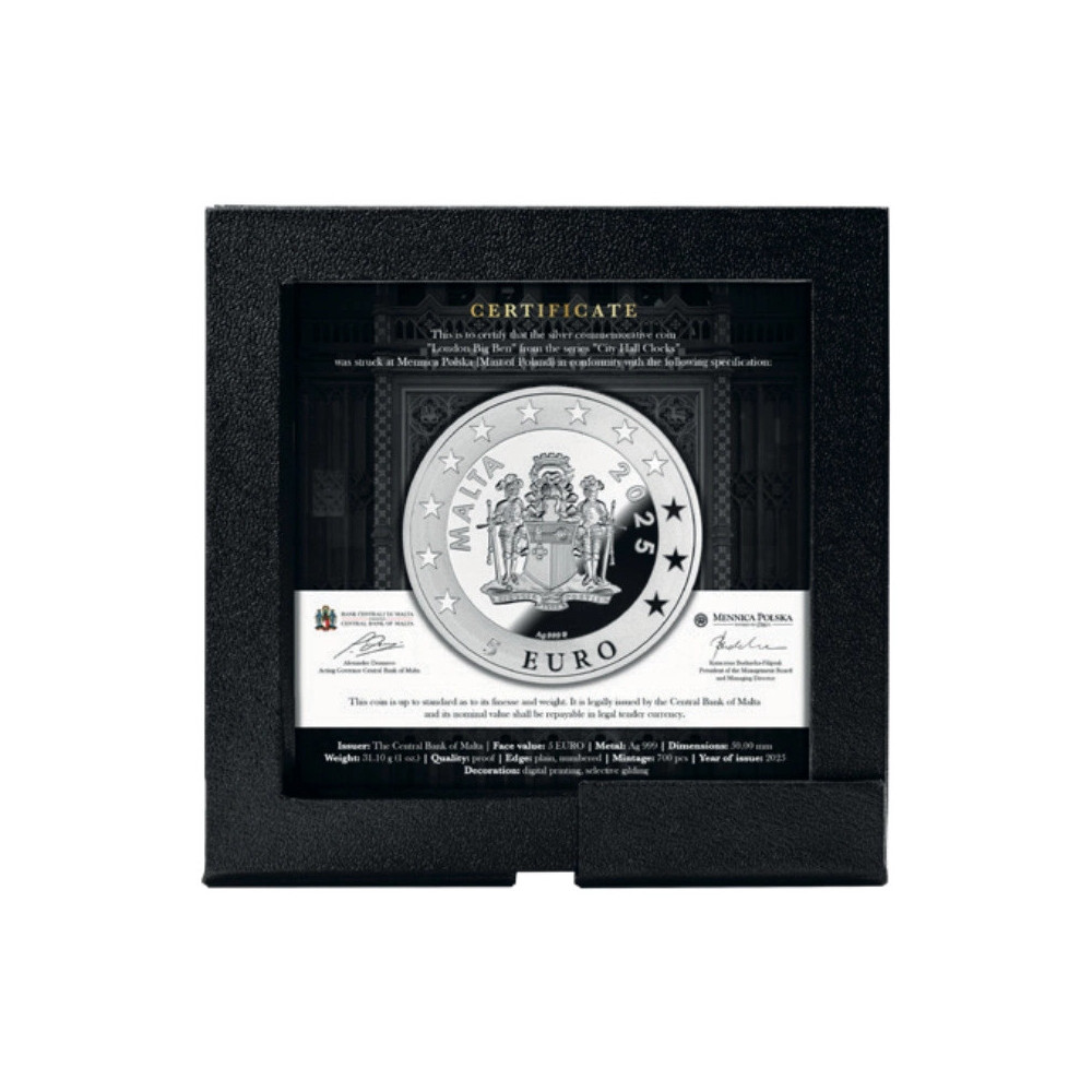 Această monedă exclusivistă din argint de 1 oz este a doua lansare din seria "City Hall Clocks" și ticăie în ritmul Londrei. Big Ben. Sublim. Neînduplecat. Trecând prin aerul cețos de deasupra Tamisei. La fiecare sfert de oră, "Westminster Quarters" sună. Ochii ridicați în timp ce pașii răsună pe pavele. Respiră aerul rece. Inimi captivate de unda sonoră. Încă întins de mână. Un supraviețuitor implacabil al furiei celui de-al Doilea Război Mondial. O dovadă a rezistenței, turnată în perfecțiunea Proof. Moneda este sigilată într-o cutie cu un certificat de autenticitate. Doar 700 de piese în lume.