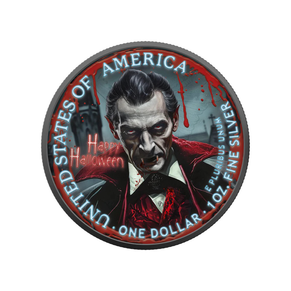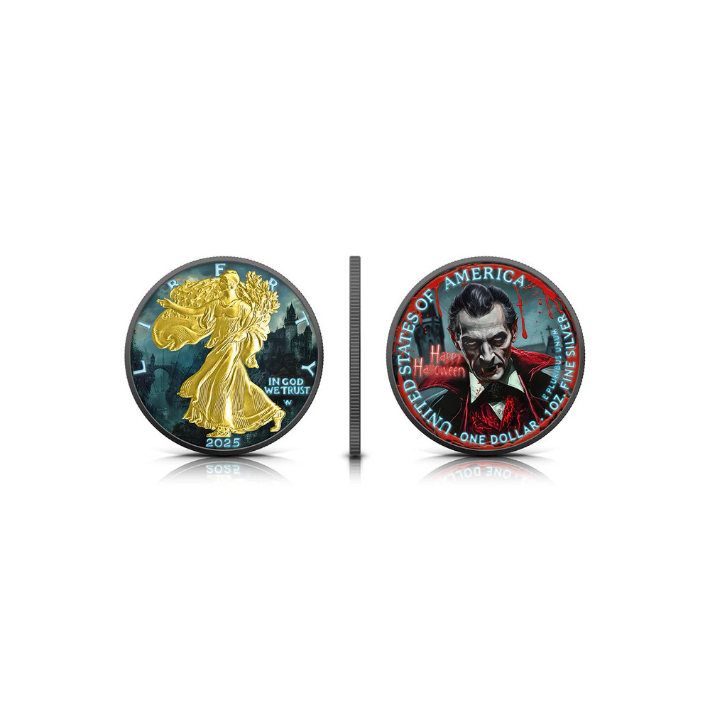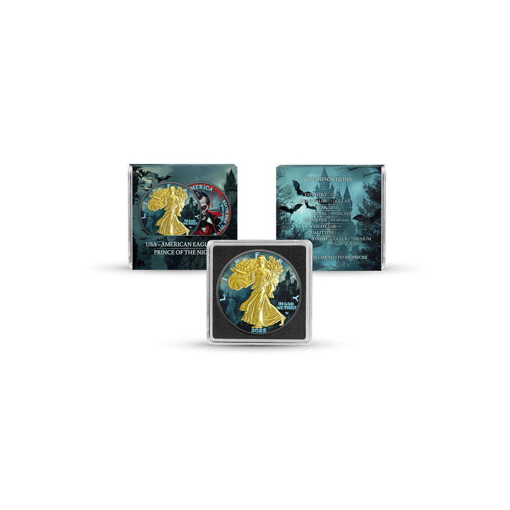 USA 2025 - American Eagle 1 oz Silver Coin - Prince of the Night (gold, ruthenium, color) este o monedă premium în ediție limitată emisă cu ocazia Halloween-ului. Fiecare monedă este fabricată din 1 oz de argint autentic American Silver Eagle (puritate 999) și apoi tratată după batere cu placare selectivă cu aur și ruteniu și culori vibrante pentru un aspect dramatic de colecție. Moneda este limitată la 300 de bucăți la nivel mondial și este livrată într-o capsulă de protecție Quadrum cu ambalaj personalizat și specificații complete.