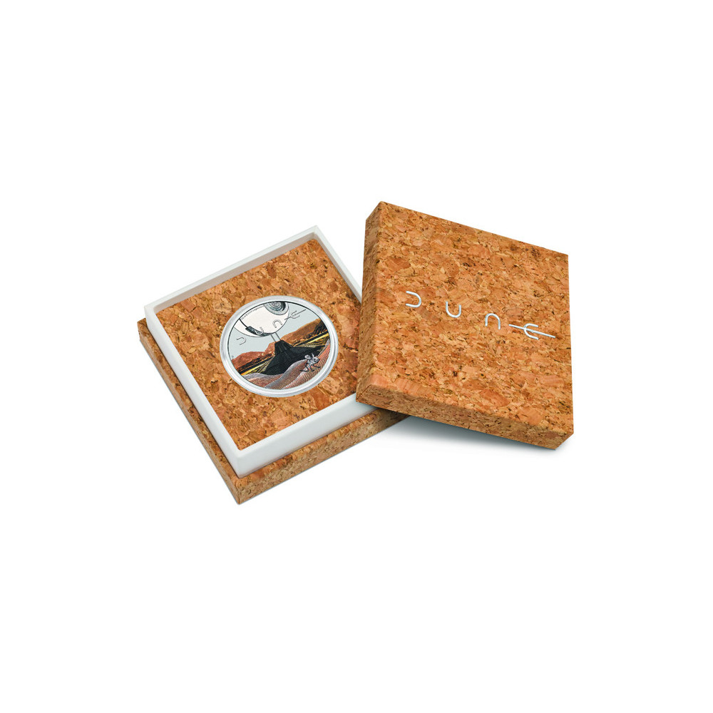 Moneda este bătută în argint pur 99,99%, cântărește 1 oz (31,107 g) și are un diametru de 40,90 mm. Emisiunea 2026 are o valoare nominală de 1 TVD și este limitată la un tiraj maxim de 3 000 de exemplare. Moneda este însoțită de un certificat de autenticitate numerotat și într-o cutie de plută certificată FSC care poartă logo-ul Dune și un ambalaj exterior tematic. Aceasta este o ofertă pentru colecționari și fani ai acestui univers.
