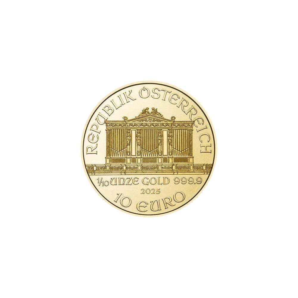 Filarmonica din Viena își datorează numele celebrei orchestre austriece, care este una dintre cele mai bune din lume. Partea frontală a monedei de aur înfățișează marea orgă a Musikverein din Viena. Sub orgă sunt ștanțate greutatea de 1/10 uncie, finețea de 999,9, anul de batere și valoarea nominală de 10 EURO. Inscripția "REPUPLIK ÖSTERREICH" este ștanțată deasupra acestuia. Pe revers sunt reprezentate câteva dintre instrumentele muzicale ale orchestrei filarmonice, iar pe marginea superioară se pot vedea numele orchestrei și moneda de aur "WIENER PHILHAMRONIKER". La fel ca monedele din aur de mai sus, Filarmonica din Viena este disponibilă în dimensiuni de 1 oz, 1/2 oz, 1/4 oz și 1/25 oz.