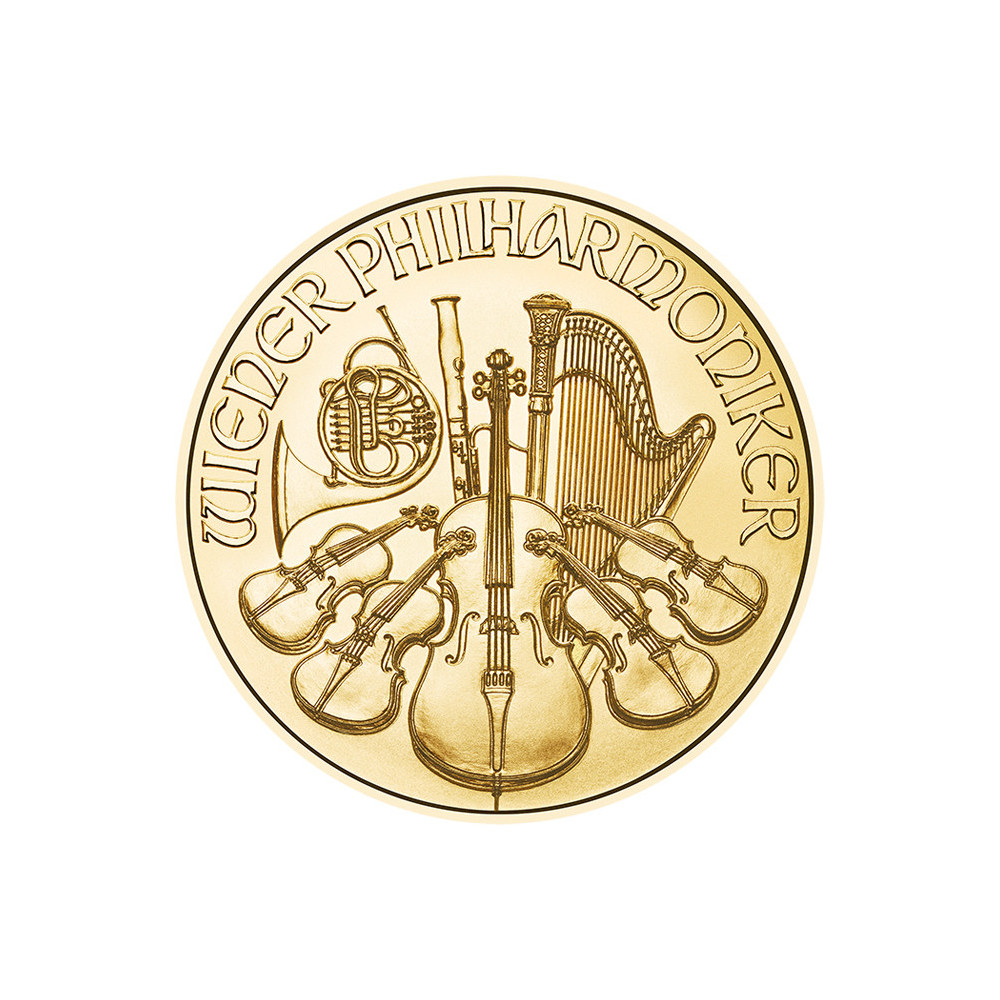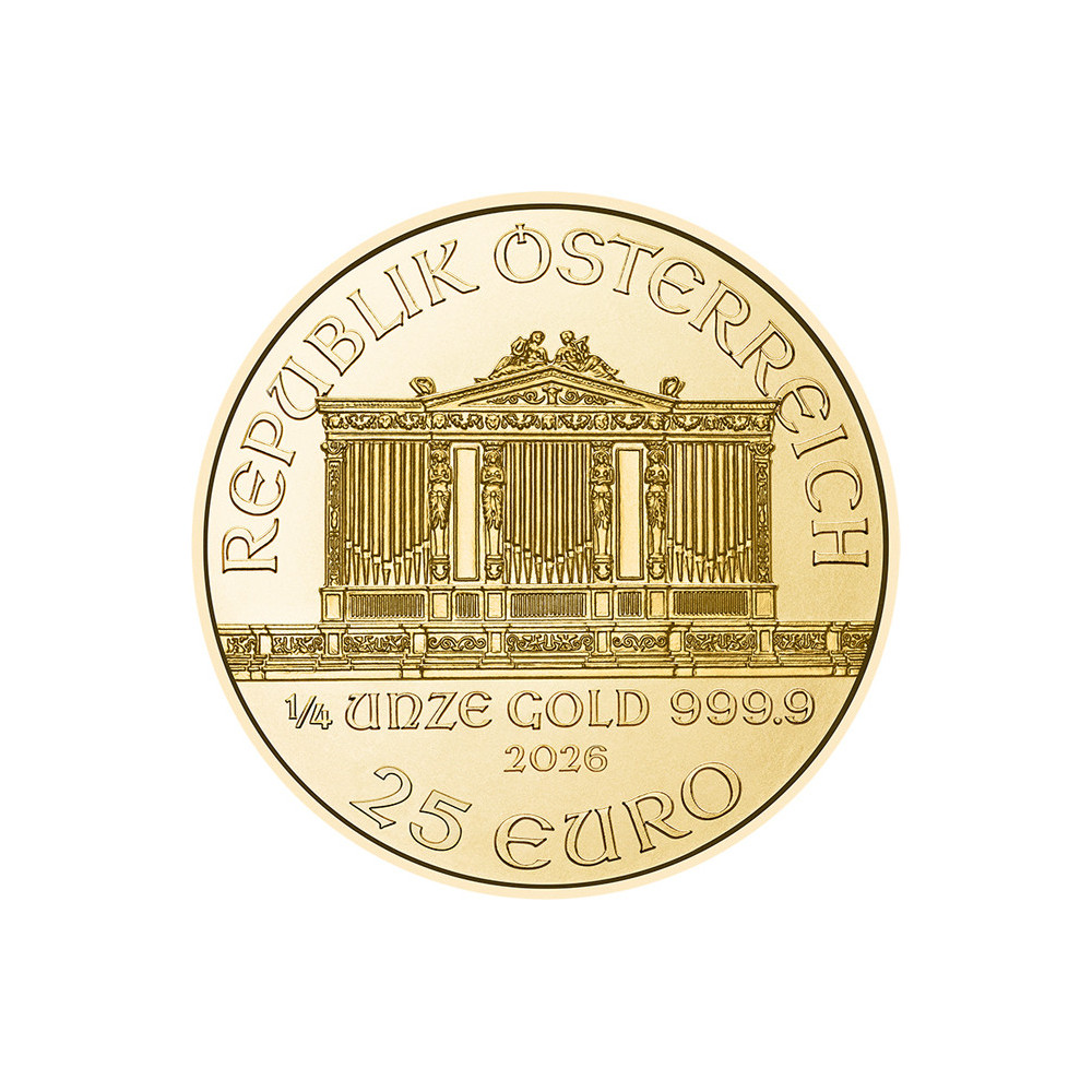 Filarmonica din Viena își datorează numele celebrei orchestre austriece, care este una dintre cele mai bune din lume. Partea din față a monedei de aur înfățișează marea orgă a Musikverein din Viena. Sub orgă sunt ștampilate greutatea de 1/4 uncie, finețea de 999,9, anul de batere a monedei și valoarea nominală de 25 EURO. Inscripția "REPUPLIK ÖSTERREICH" este ștanțată deasupra acesteia. Pe revers sunt reprezentate câteva instrumente muzicale ale orchestrei filarmonice, iar pe marginea superioară se poate vedea numele orchestrei și moneda de aur "WIENER PHILHAMRONIKER". La fel ca monedele din aur de mai sus, Filarmonica din Viena este disponibilă în dimensiuni de 1oz, 1/2oz, 1/10oz și 1/25oz.